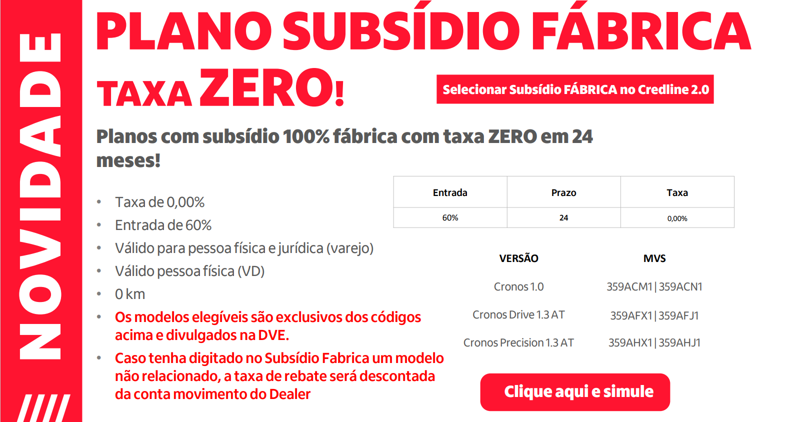Perceba que, ao realizar um financiamento com as condições acima (prazo 24x, 60% de entrada, modelo Cronos 1.0, taxa 0%, PF/PJ e veículo ZERO KM), o financiamento contará com o Plano Subsídio Fábrica taxa ZERO.